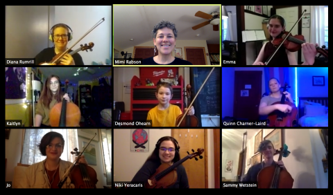 “By the time the stay-at-home order was announced, I had already started thinking about how to manage my classes and ensembles online,” remarks Mimi Rabson, BREO's founder and artistic director. “It seemed possible to handle BREO the same way with the same technology.” Rabson, an associate professor in the String Department who specializes in improvisation, technology, and recording techniques for strings, worked closely with the students to continue BREO despite not being able to meet in person. “Most of the students were already using Zoom, Google Hangouts, and FaceTime,” says Rabson. “They assured me it would be a doable transition, and they taught me a lot of tricks for using the technology.”